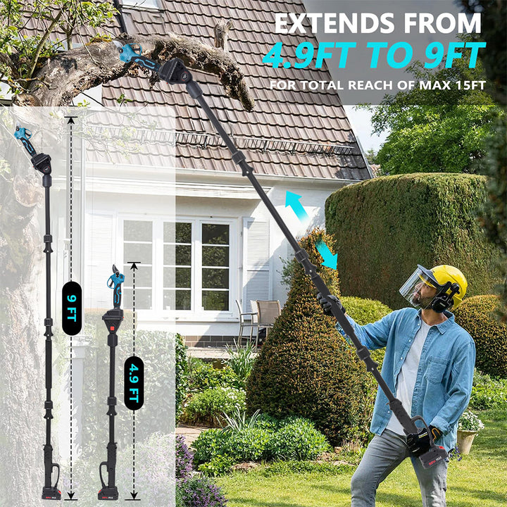 【Elektrische Gartenschere mit Verlängerungsstange】 Die elektrische Gartenschere ist mit einer 2,5 Meter langen Verlängerungsstange ausgestattet, die Teleskopstange kann von 1,3 m auf 2,5 m verlängert werden und erreicht bis zu 4,5 m Höhe, wodurch Sie in verschiedenen Winkeln bis zu 15 Fuß trimmen können, ohne dass eine Leiter erforderlich ist.