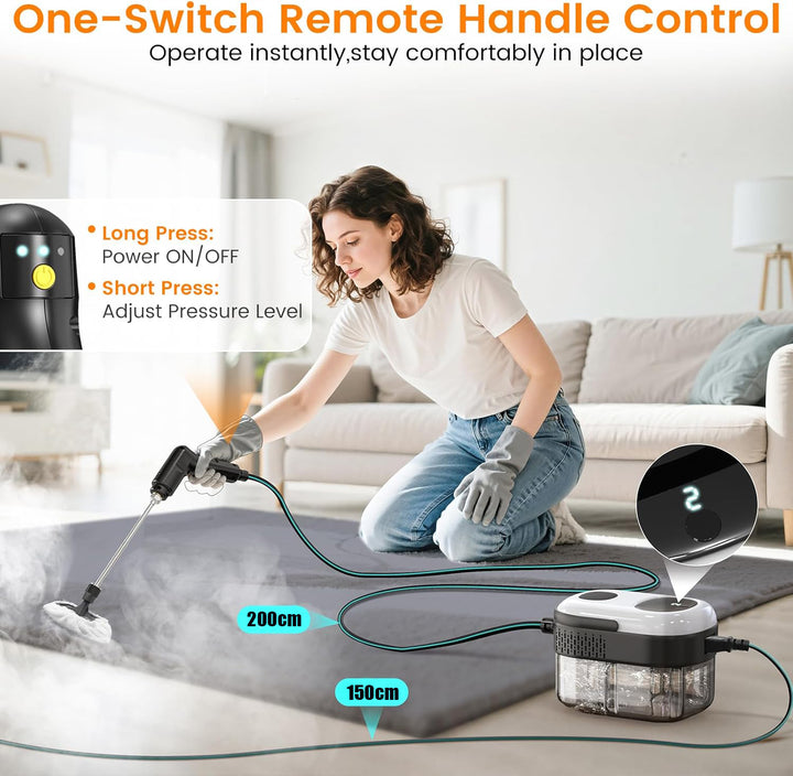Erhöhen Sie Ihre Reinigungsroutine mit unserem vielseitigen Dampfreiniger für Zuhause. Er wird mit einem extra langen 150 cm langen Netzkabel und einem 200 cm Dampfschlauch geliefert, sodass Sie Ihr gesamtes Zuhause reinigen können, ohne den Stecker zu ziehen oder neu zu positionieren. Das leichte Design ermöglicht es Ihnen, sich mühelos von Raum zu Raum mit Leichtigkeit zu bewegen und keine unordentliche Reinigung danach zu genießen. Außerdem macht seine kompakte Größe die Aufbewahrung zum Kinderspiel – er passt problemlos in Schränke oder unter Waschbecken.