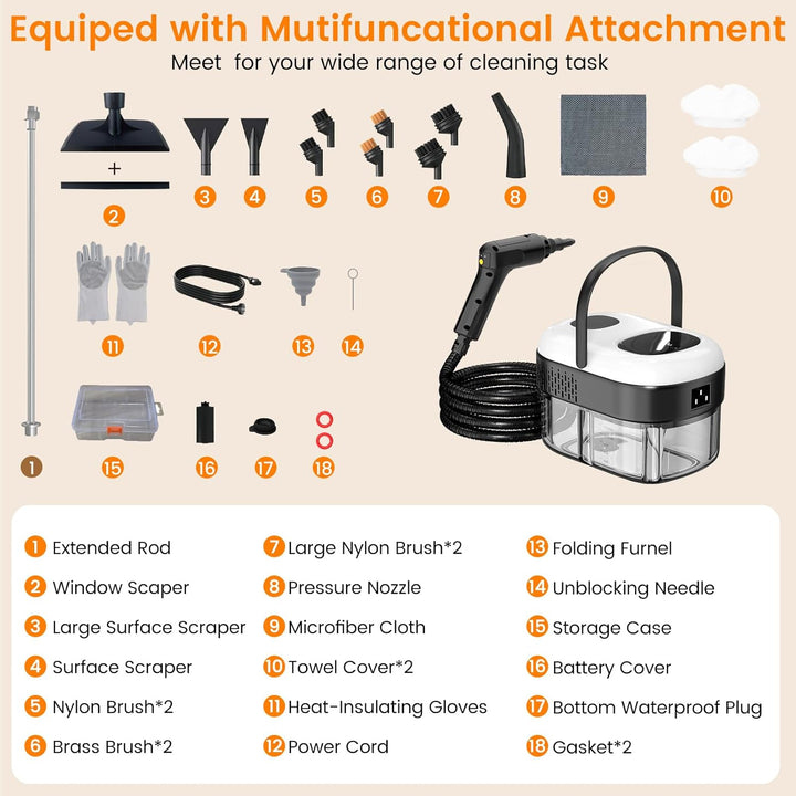 4 x Nylon und 2 x Messingbürsten für hartnäckigen Schmutz, 1 x Verlängerungsstange für hohe Stellen, 1 x Fensterschaber, 2 x Oberflächenschaber zum Entfernen von klebrigen Rückständen, 1 x Ellenbogendüse, 1 x isolierte Handschuhe, 1 x Reinigungstuch und 2 x Mikrofaser-Pad für Tiefenreinigung. Auch mit 1 x Aufbewahrungsbox. Gehäuse, 1 x faltbarer Trichter, 1 x Anti-Verstopfungsnadel, 2 x Dichtung, 1 x Batterieabdeckung und 1 x wasserdichter Stecker für dauerhafte Leistung und Haltbarkeit.