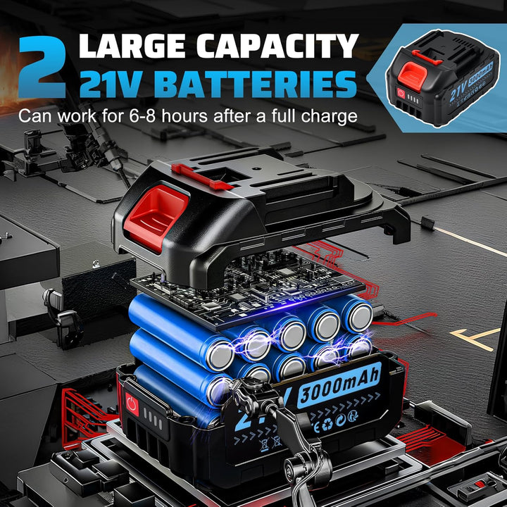 【Lange Laufzeit & zuverlässige Leistung】Die 2 wiederaufladbaren 21V/3000mAh Lithium-Akkus bieten ausreichend Power für den ganzen Tag. Nach nur 1-1.5 Stunden vollständig aufgeladen. Kann aber 4-5 Stunden lang effizient laufen.Der Überhitzungsschutz und der effiziente bürstenlose Motor garantieren eine zuverlässige Leistung