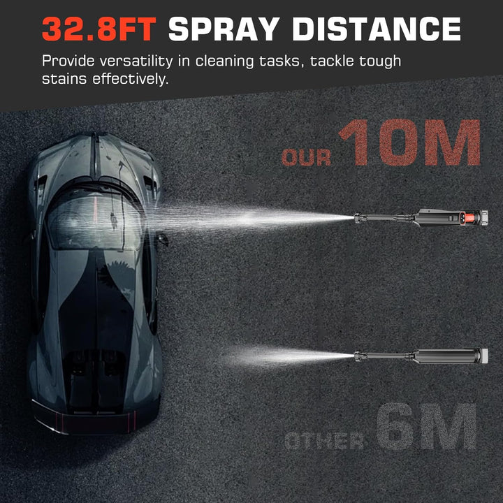 【Zwei Akkus mit hoher Kapazität】 Dieser Hochdruckreiniger ist mit zwei wiederaufladbaren Batterien ausgestattet, die 1,5-2 Stunden halten können. Der tragbare Hochdruckreiniger verfügt über ein kabelloses und leichtes Design, einfach zu transportieren und zu verwenden. Der maximale Sprühabstand beträgt 10 m. Mit zwei Akkus müssen Sie sich keine Sorgen machen, dass Ihnen der Strom ausgeht.