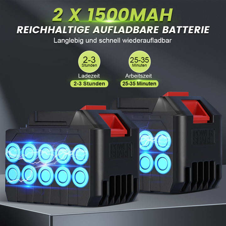 Doppelakku mit langer Laufzeit: 2 wiederaufladbare 1500-mAh-Lithium-Akkus ermöglichen 20–30 Minuten ununterbrochene Nutzung. Volle Aufladung in nur 2–3 Stunden – ideal für den Einsatz ohne Stromanschluss.