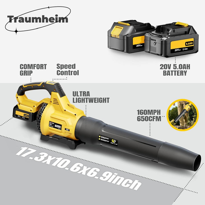 【Upgrade auf 2 Akkus & Schnellladung】Elektrischer kabelloser Laubbläser wird mit zwei 20V-5,0-Ah-Batterien und einem Ladegerät geliefert, läuft bis zu 150 Minuten im Low-Speed-Modus. (Hinweis: der Akku ist nicht kompatibel mit Dewalt.)