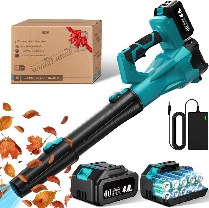 Akku Laubbläser, 6 Stufen Elektrischer Laubgebläse, mit 2x 4,0Ah Akku und Ladegerät, Kabellos laubbläser für Laub/Staub/Schnee Ganzjährig,Zubehör inkl