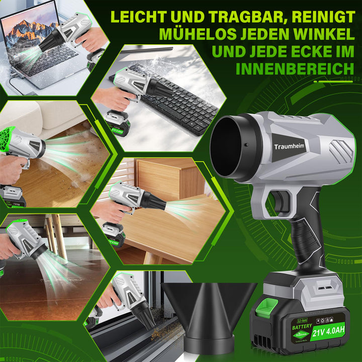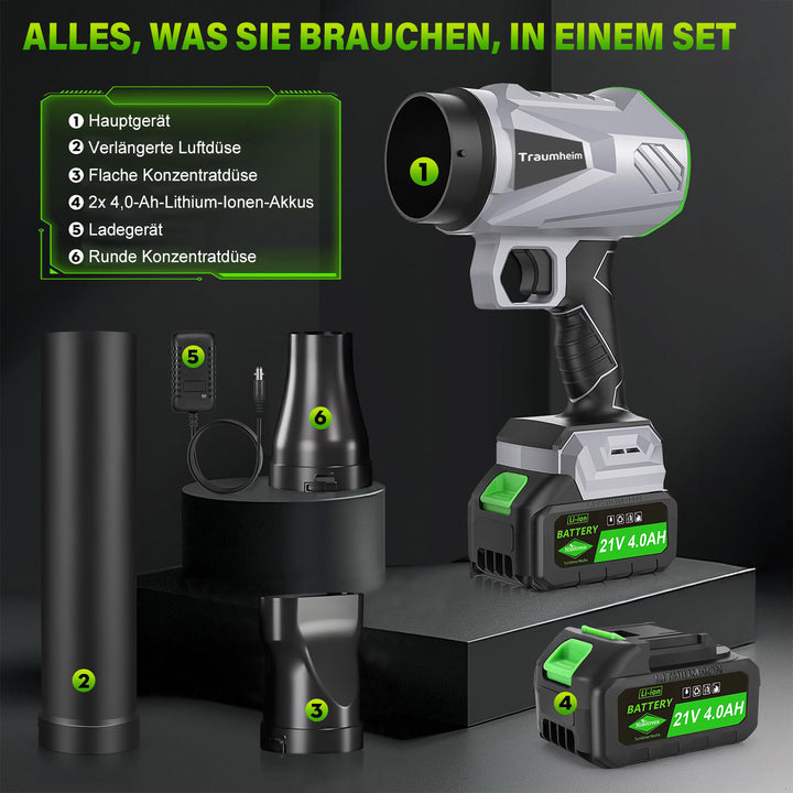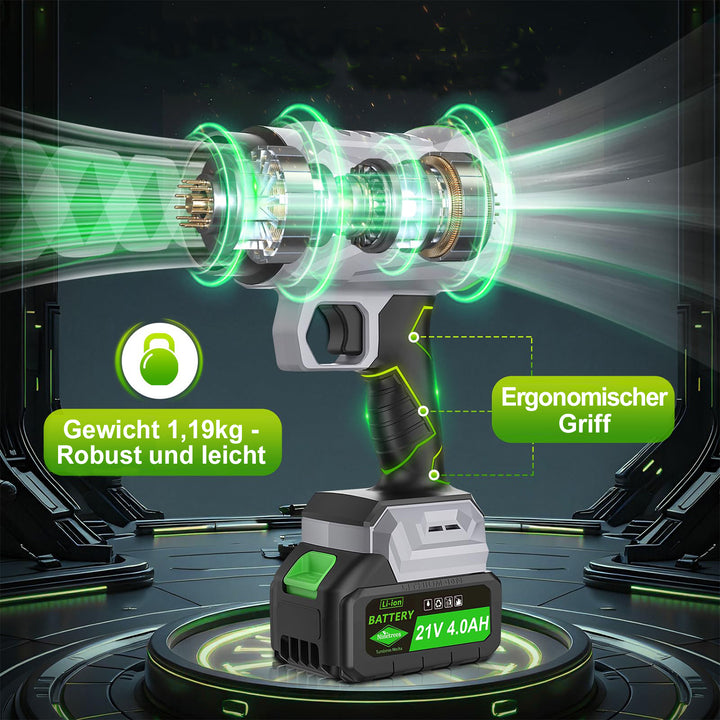 Akku Laubbläser, Handgebläse mit Turbostrahl 65m/s, 400CFM, Bürstenloser Motor, 2×4000mAh Akku, Leicht, Kabellos, Garten, Terrasse, Autoreinigung