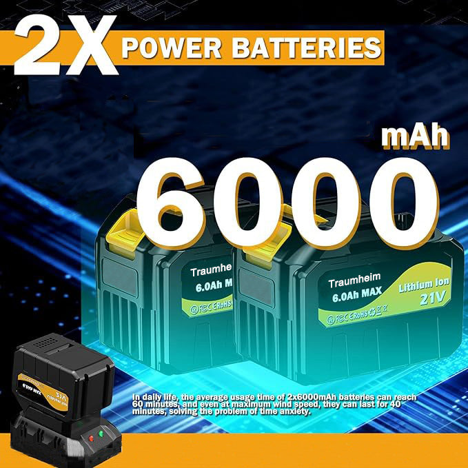 ️【Zwei 6000 mAh Akkus & Ladegerät】Im Lieferumfang enthalten sind 2 leistungsstarke 21V/6000mAh Akkus, die zusammen bis zu 60 Minuten Laufzeit bieten. Dank ladegerät ist jeder Akku in ca. 23 Stunden vollständig geladen, ideal für durchgehendes Arbeiten.