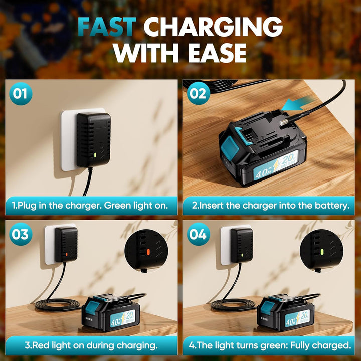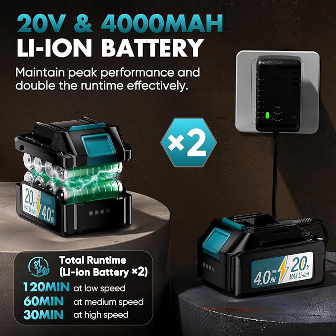 【2 x 4,0 Ah und 20 V Lithium-Batterien】Unser kabelloser Laubbläser ist mit zwei 4,0-Ah-Lithium-Batterien ausgestattet, die bis zu 120 Minuten Laufzeit im Low-Speed-Modus und 30 Minuten im Hochgeschwindigkeitsmodus bieten. Eine praktische Batterieanzeige (25%-50%-75%-100%) ermöglicht es Ihnen, die verbleibende Leistung und den Ladefortschritt mit Leichtigkeit zu überwachen.