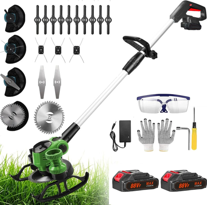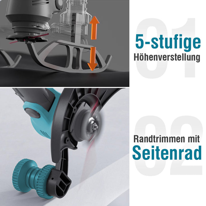 Kabellos Rasentrimmer Mit zusätzlicher Grasschubhalterung -Akku rasenkantenschneider, eingestellt werden, um den Druck auf den unteren Rücken zu verringern, Geeignet für verschiedene Höhen, geeignet für ältere Menschen, Frauen und Anfänger zu verwenden. Installieren Sie die zusätzliche Grasschubhalterung und das gebogene Metallmesser, um einen Mini Mäher zu schaffen, der problemlos das Mähen großflächiger Rasenflächen bewältigen kann