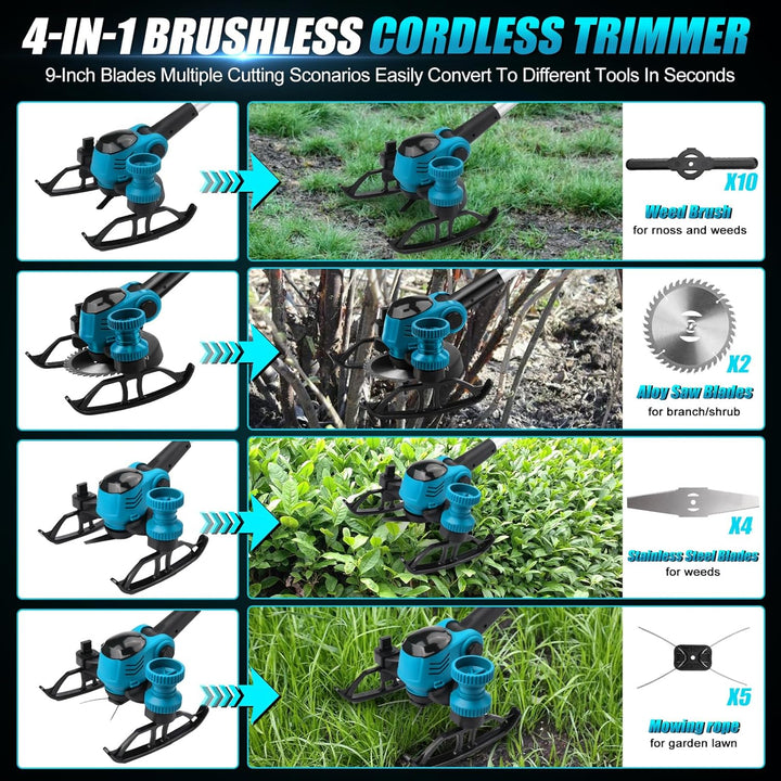 4 IN 1 Akku Rasentrimmer - Akku-Rasentrimmer elektro set wird mit 4 IN 1 Rasentrimmermesser messer, 10 Kunststoffmessern, 4 Edelstahlmessern und 2 Rundmesser, und 3x Rasentrimmerfaden, Die Kunststoffmesser und fadenspule eignen sich für das Trimmen von weichem Gras, die Rundmesser aus Manganstahl für das Trimmen von dickeren Strauchzweigen, und die Metallmesser aus Edelstahl für das Trimmen von Rasen, Unkraut und kleinen Sträucher