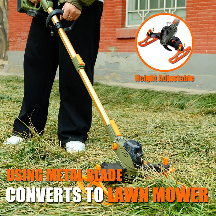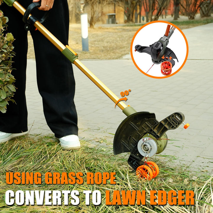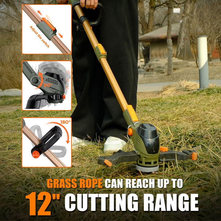Akku Rasentrimmer mit 2× 4000mAh Akkus, Bürstenloser Motor Freischneider mit 3-in-1 Schneidsystem, Teleskopstiel, 90° schwenkbarer Kopf