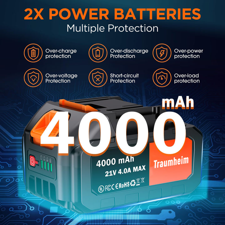 Zwei 21V 4.0Ah Akkus sorgen für ausdauernden Betrieb bei großer Schnittfläche. Ideal für große Gärten und längere Arbeitseinsätze – inklusive ladegerät.