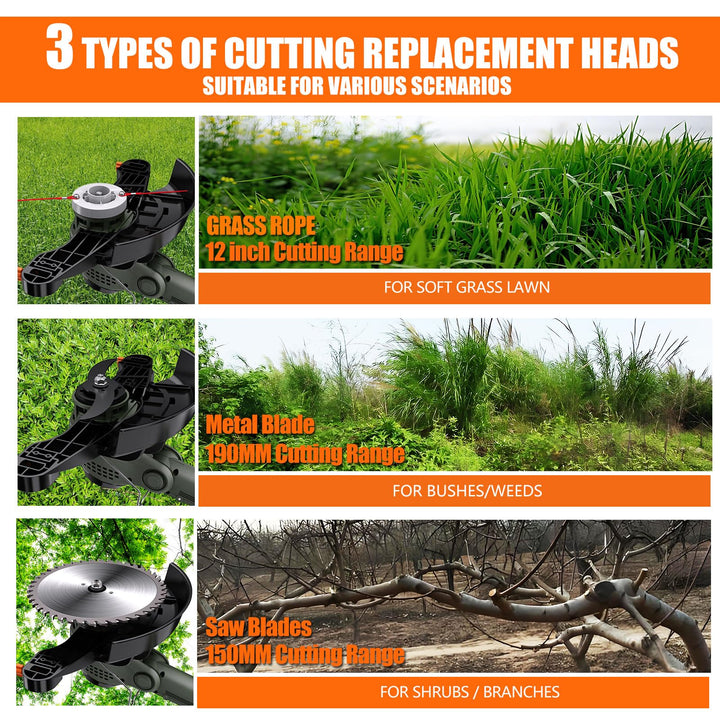 Das Gerät bietet drei Schnittoptionen: Nylonfaden (30 cm) für feines Trimmen, gebogene Metallklinge (190 mm) mit Schiebebügel für mittleres Gras und Sägeblatt (150 mm) für Sträucher. So passt sich das Gerät jeder Anwendung an.