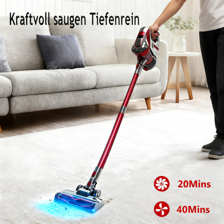 Der wiederaufladbare Stick Staubsauger wird mit einem abnehmbaren Akku mit großer Kapazität und 2 einstellbaren Saugmodi geliefert, die maximale Laufzeit kann bis zu 40 Minuten (unter dem minimalen Saugmodus) erreichen, um Ihre täglichen Reinigungsbedürfnisse zu erfüllen.