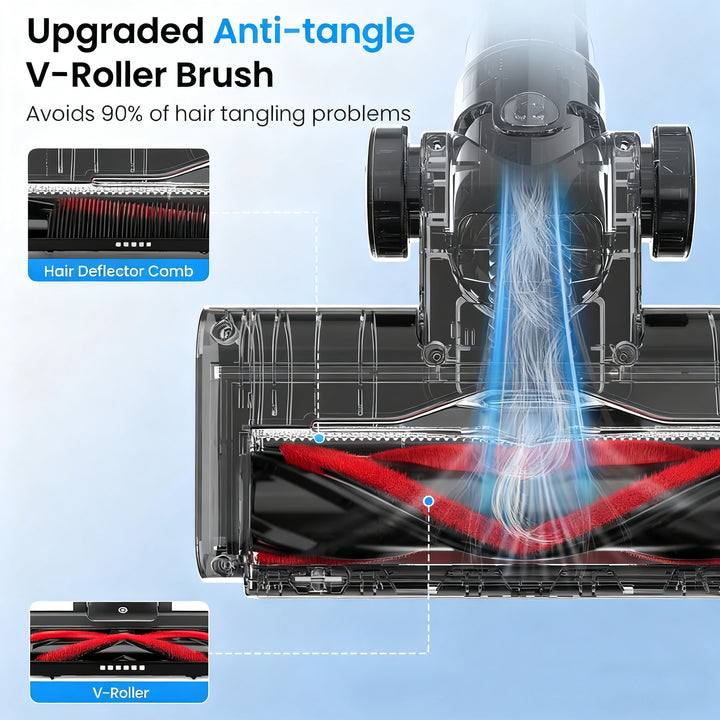 Die neueste V-förmige Bürstenleiste und das Deflektorkamm-Design lösen effektiv das übliche Verhedderungsproblem traditioneller Staubsauger.