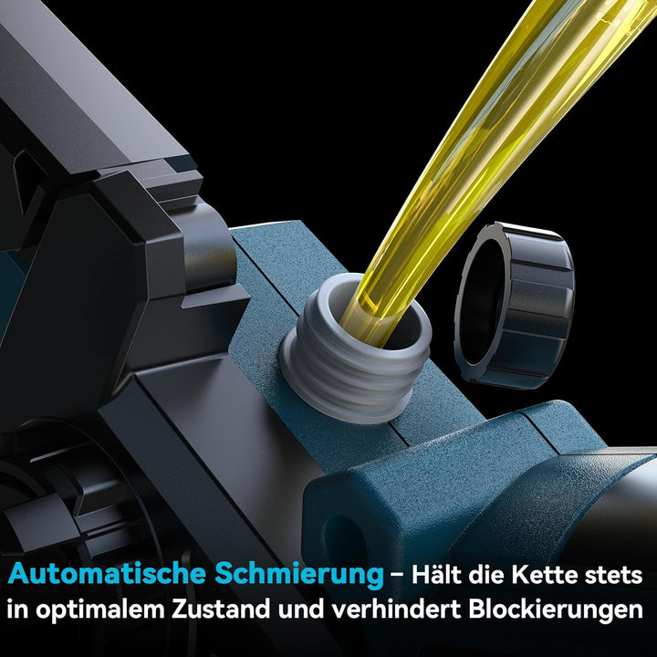 [Automatische Kettenschmierung] - Dank des verbesserten Schmiersystems wird das Problem des Ölverlusts vollständig vermieden. Die kabellose Mini-Kettensäge ist mit einer automatischen Kettenschmierung ausgestattet. Der halbtransparente Öltank ermöglicht eine einfache und schnelle Kontrolle des Ölstands