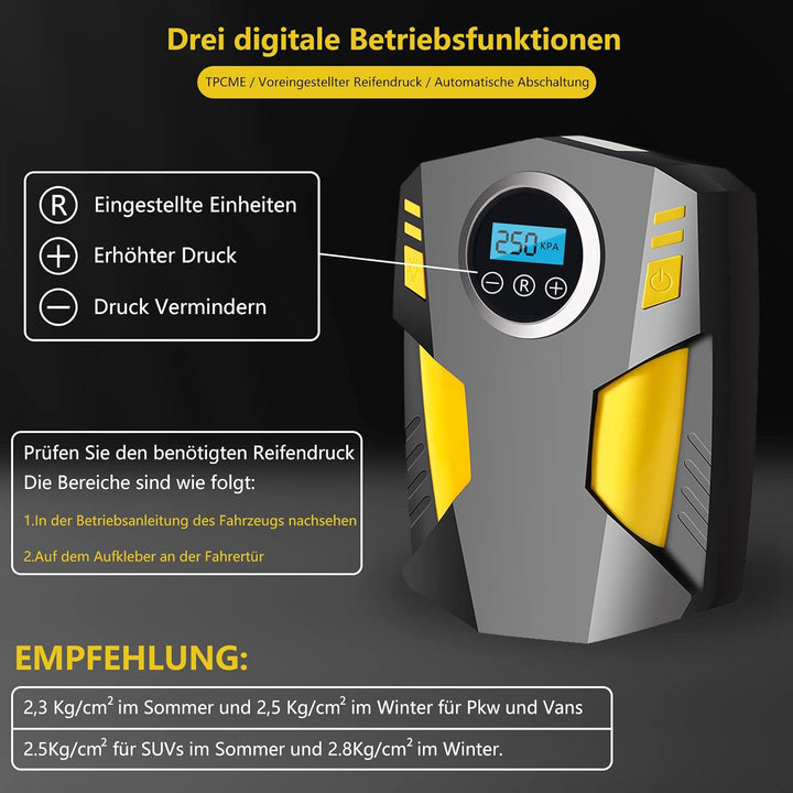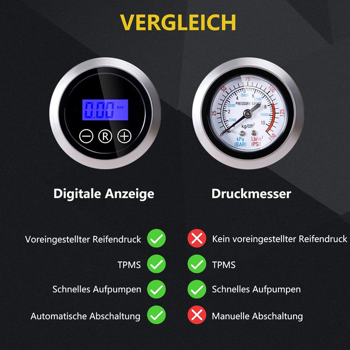 Intelligente Drucksteuerung: Zieldruck einstellen → Kompressor stoppt selbstständig bei Erreichen. Kein Überdruck-Risiko – ideal für Reifenschonung und Fahrsicherheit.