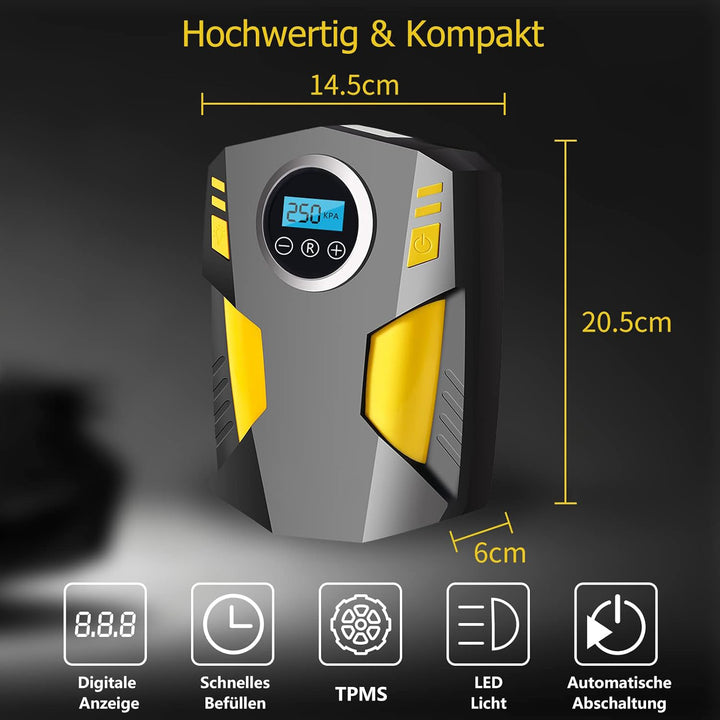 Luftkompressor Autoreifen 12V Netz, 10,3Bar Elektrische Luftpump, Digitaler Anzeige, LED-Leuchte Mini-Kompressor für Auto Fahrrad Bälle 4 Ventile