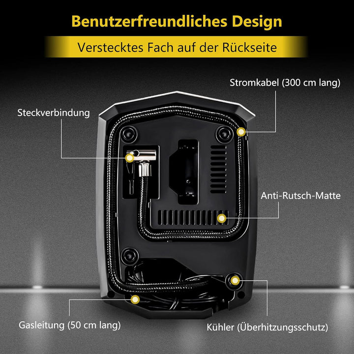 Kompakt & mobil: Leichtes Gehäuse + 3m Verlängerungskabel erreicht alle Reifen bequem.