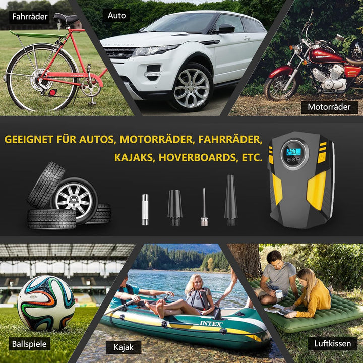 4 Adapter inklusive: Für Autos, SUVs, Motorräder, Fahrräder, Luftmatratzen, Bälle und kleine Schlauchboote.