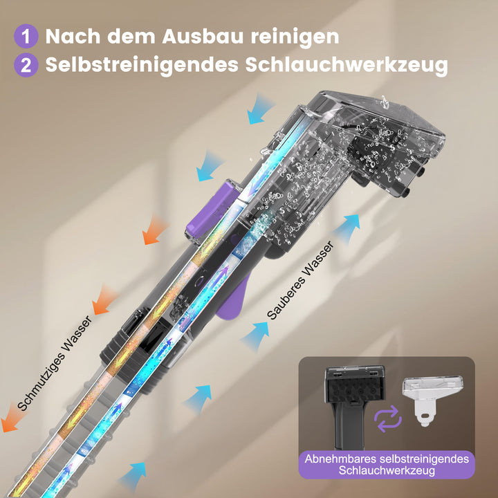Nie wieder schmutzige Bürsten von Hand säubernMit nur einem Knopfdruck aktiviert sich das integrierte Selbstreinigungssystem und spült sowohl den Saugweg als auch die Bürstenköpfe. Dank dem Überlauf-Schutz für den Schmutzwassertank bleibt Ihre Hand stets sauber – ideal für jedes moderne polsterreiniger gerät.